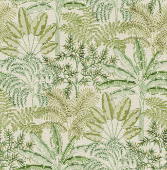 Wallpaper with a vinyl surface, coarser cream fabric texture, plant and leaf motifs in shades of green.