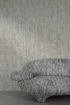 Wallpaper with a vinyl surface, appearance and texture evoking wood in grey tones.