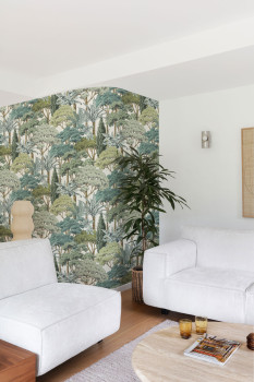 Wallpaper with a vinyl surface, cream background, tree motifs in shades of green and brown, fine texture.
