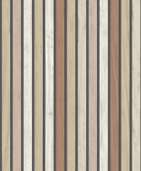 Wallpaper with a vinyl surface, imitation of wood, wooden boards, cladding, slats, slightly embossed texture, shades of cream, beige, beige-pink and terracotta.