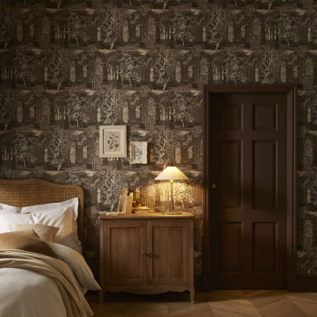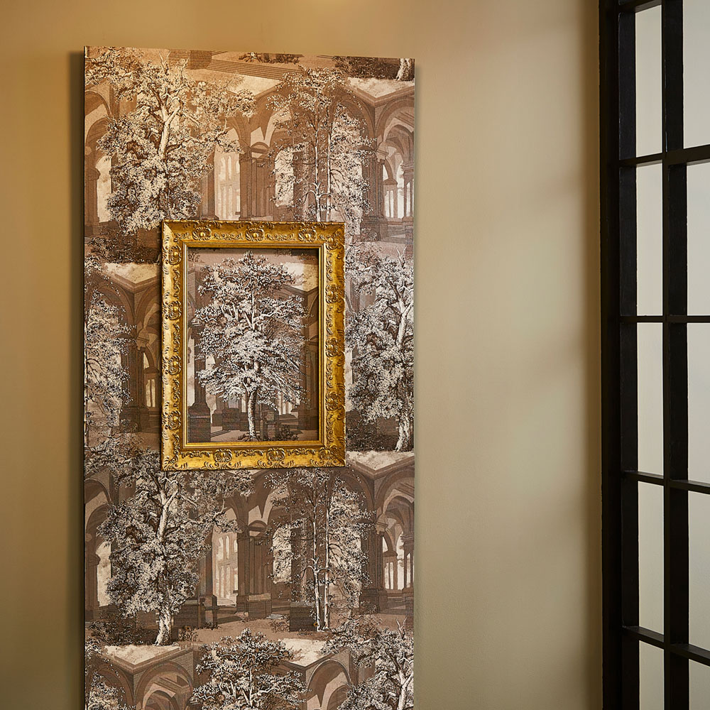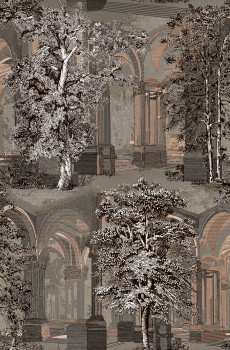 Wallpaper with motif of historical arcades and trees in semi-gloss shades of brown and grey-brown.