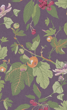 Wallpaper, plum-purple background imitating a fabric texture, motifs of leaves and fruits.