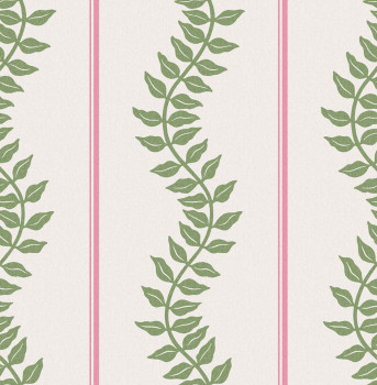 Wallpaper, light beige background, pink stripes, green laurel leaves.