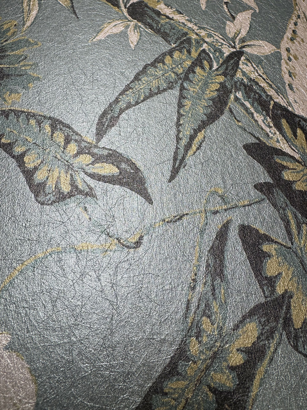 Wallpaper with motif of exotic birds among flowers and tree branches, semi-gloss turquoise background, gold-beige and turquoise pattern, fibrous texture.