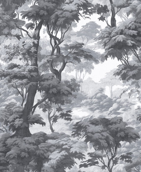 Wallpaper with motif of forest trees in shades of grey and black, fabric-look effect.