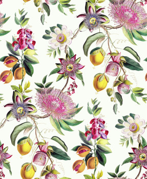 Wallpaper with white background, motif of blooming Passionflower branches.