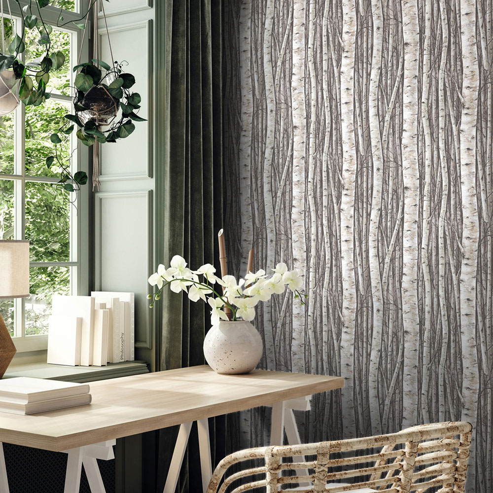 Wallpaper with a vinyl surface, striped texture with a birch grove tree motif in shades of grey and brown.