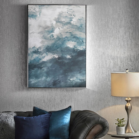 This beautiful design features an abstract cloudy sky in beautiful deep tones of blue and teal. Finished off perfectly in a silver box frame this beautiful framed canvas will add depth to any wall.