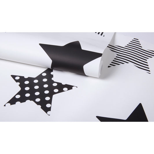 White wallpaper with black stars. To the children's room or children's corner. Easily combine with related patterns.
