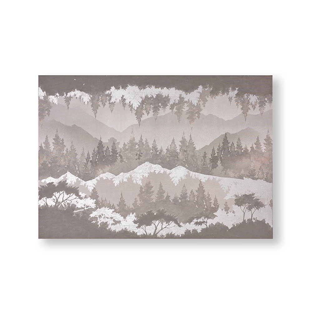 Printed canvas - picturesque landscape in a morning haze - with subtle metallic reflections.
