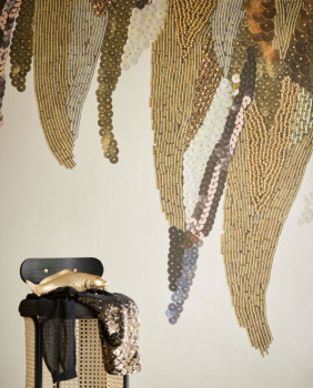 MUSEUM wallpaper collection - A place where art and fashion meet in lush designs and stunning creations. Transform your interior into a contemporary masterpiece with this collection. Surround yourself with sophisticated materials and sublime colours. From deep burgundy to rich shades of blue and green to shimmering sand and powdery pink. Admire the lavishly painted flowers, birds and butterflies on canvas. Line-drawn flowers on matte paper, plucked from ancient etchings. Enjoy the wonderful textures, from velvety flock to the softest rib wallpaper with a colour gradient. Or choose understated chic with a grand plissé with metallic accents and a refined plain sprinkled with weathered gold dots. Turn your home into a work of art where wallpowers with magnificent birds and flowers burst off the wall. An embellished motif of beads and sequins add that wow factor to your interior.