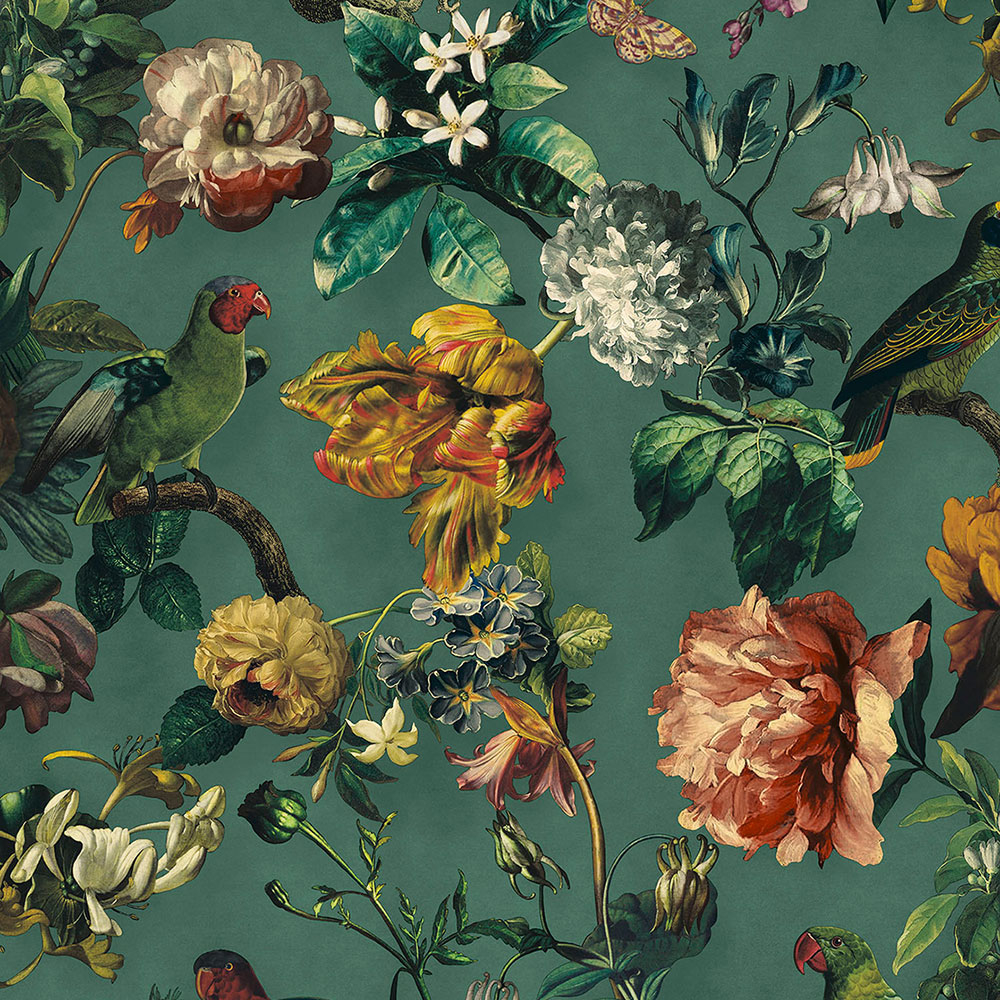 Multicolored luxury wallpaper with parrots and flowers inspired by the paintings of Dutch Golden Age artists.