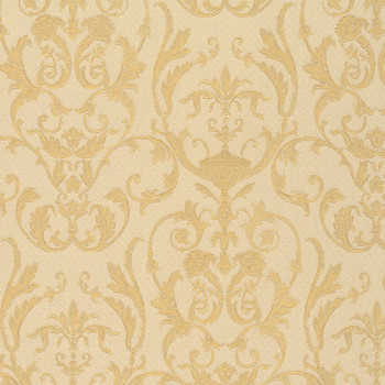 Vinyl, light beige wallpaper with gold ornamental pattern. Soft semi-gloss.