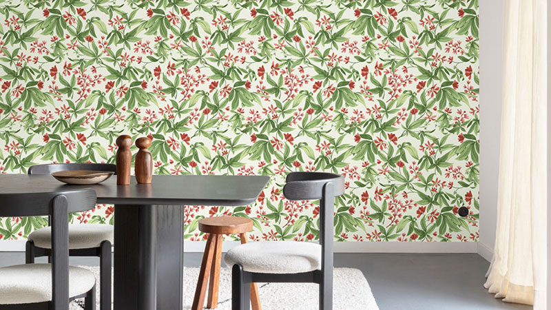 Inia wallpapers bring warmth, comfort, and a pleasant touch to your home. You’ll find floral and leaf patterns in cheerful colors, as well as delicate motifs in muted tones on a neutral background. The collection’s modern, slightly natural feel is enhanced by an abstract grasscloth texture that evokes finely woven natural materials.