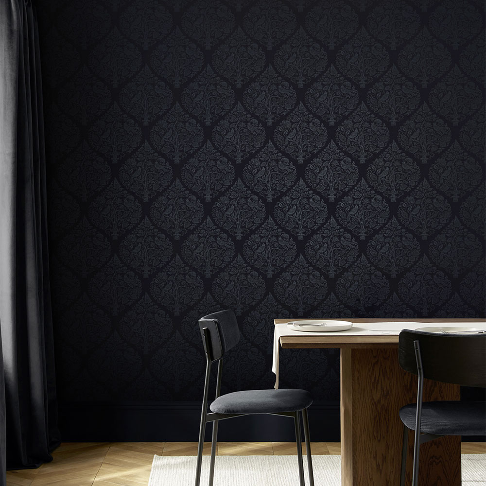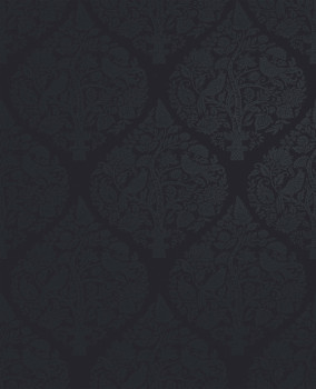Non-woven wallpaper, matte dark blue background, semi-gloss metallic ornamental pattern featuring plants and birds.