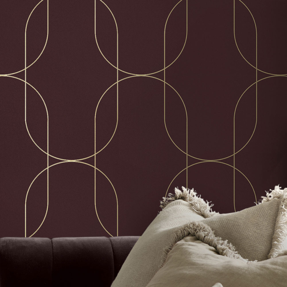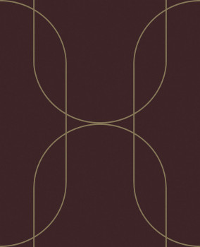 Non-woven wallpaper, matte finish, fine-textured, burgundy color, with semi-gloss gold lines.