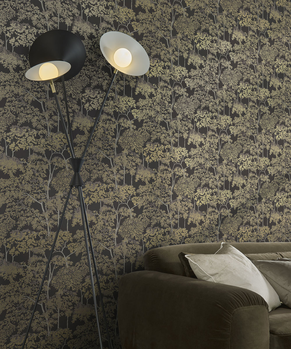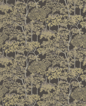 Non-woven wallpaper, with a matte dark brown background, featuring trees with semi-gloss gold leaves and gray-silver trunks.