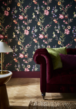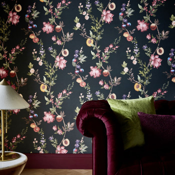 Non-woven wallpaper, black background, twigs with flowers and fruit.