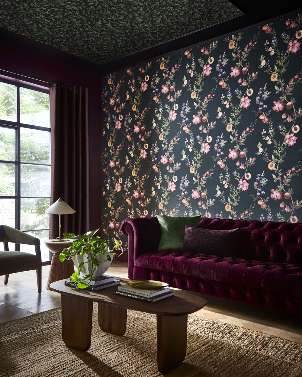 You will find striking floral patterns, ranging from tiny blossoms on dark backgrounds that feel bold, elegant, and slightly seductive, to softer variations on light backgrounds. A beautiful feature is the branches of peach trees and other fruit trees, full of blossoms and fruit, adding a sense of naturalness, freshness, and a romantic atmosphere to the wallpapers.