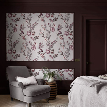 Non-woven wallpaper, pink background, twigs with flowers and fruit in shades of pink.