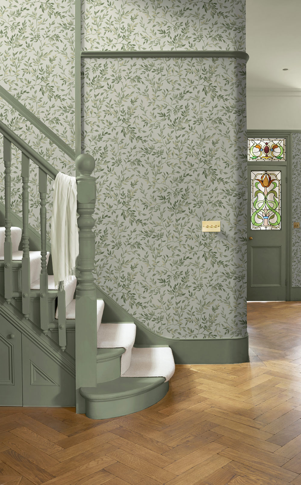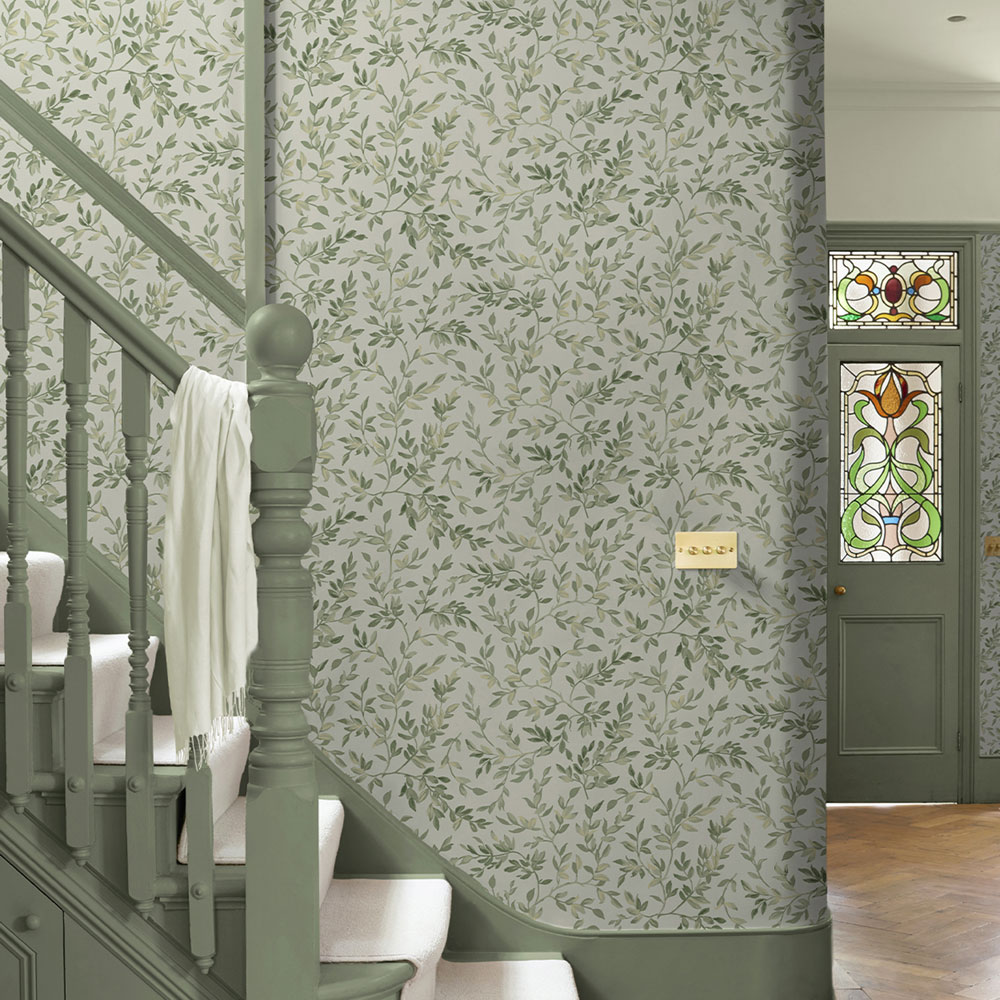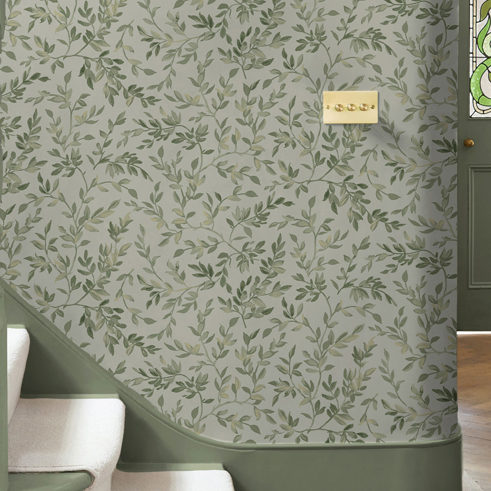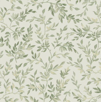 Non-woven wallpaper, twig and leaf motif, shades of green.