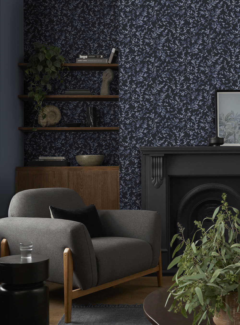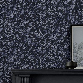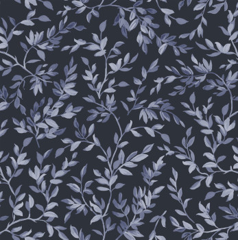 Non-woven wallpaper, dark blue background, twigs in shades of blue.