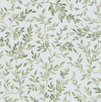 Non-woven wallpaper, light blue background, with a motif of twigs and leaves in shades of green.
