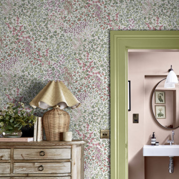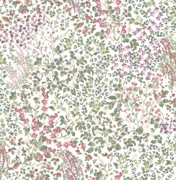 Non-woven wallpaper, white background, floral pattern in shades of green, pink, red, and lilac.