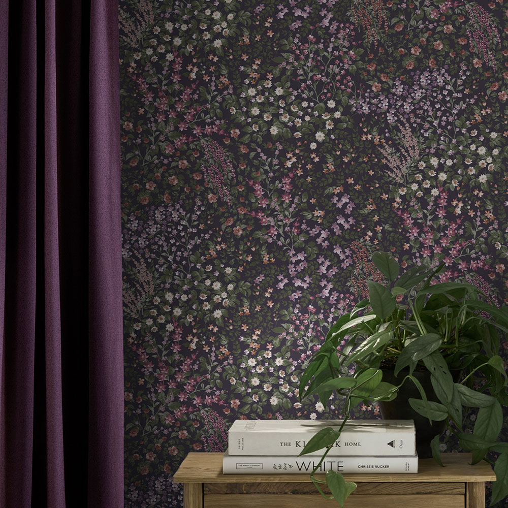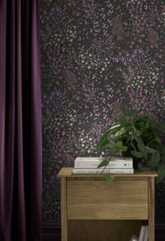 Non-woven wallpaper, dark purple background, floral pattern in shades of green, purple, pink, and orange.