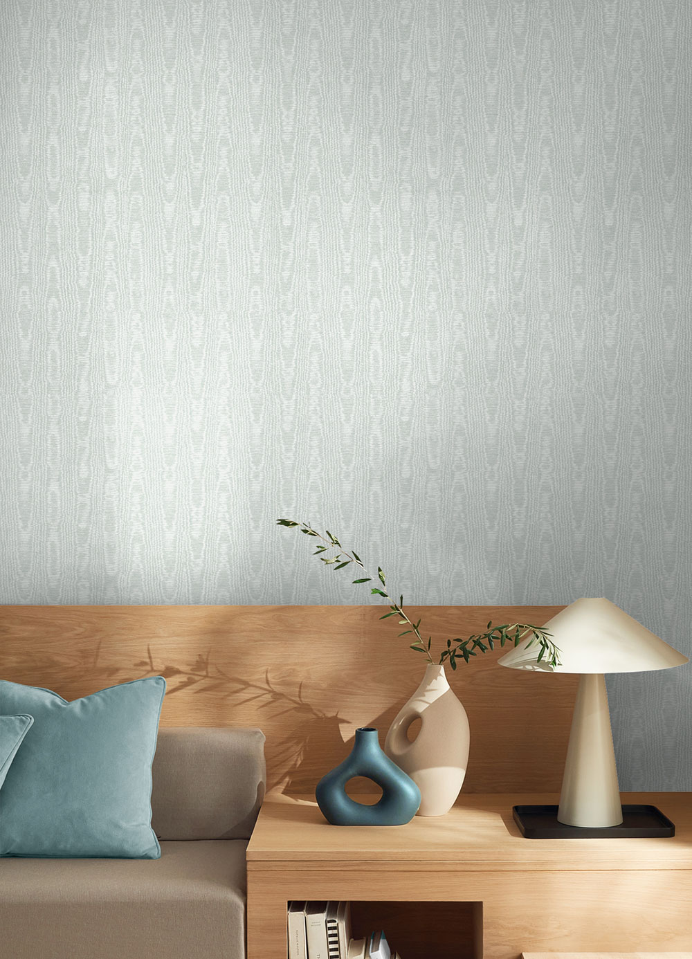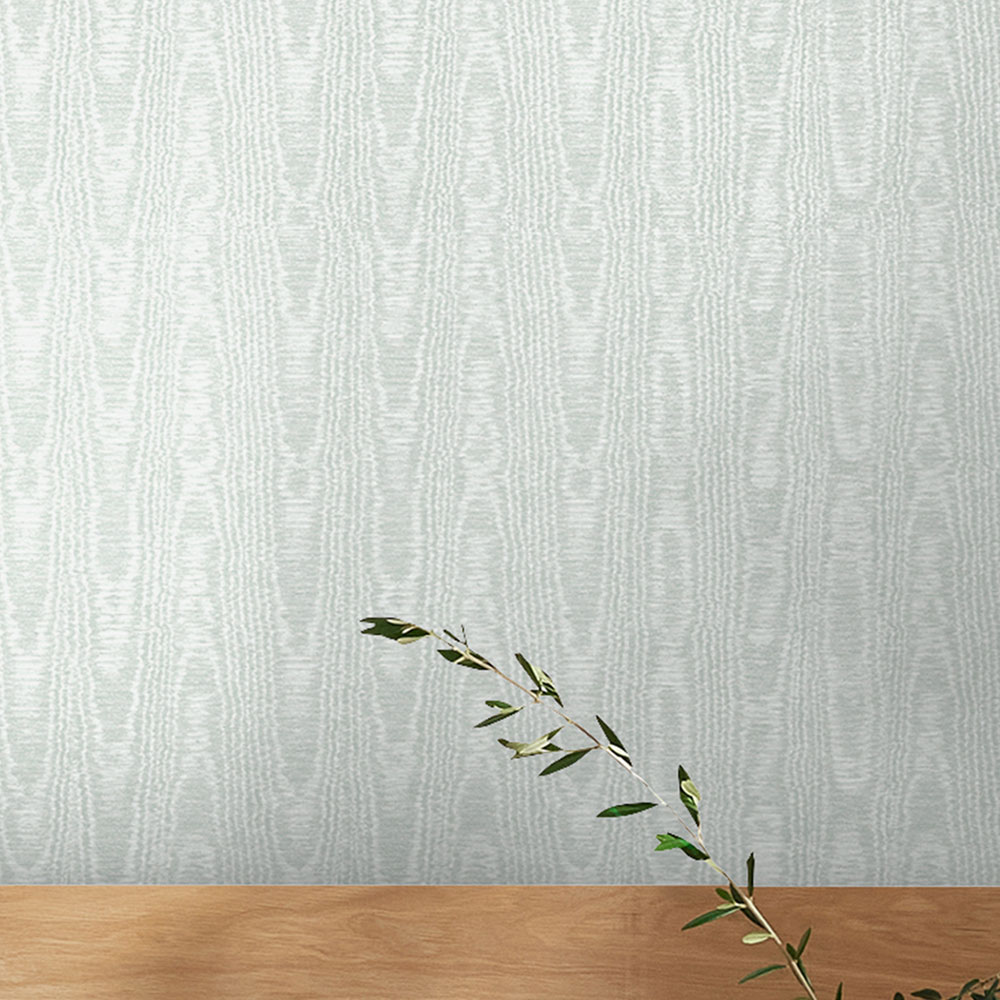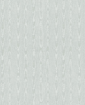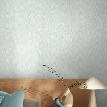 Non-woven wallpaper, semi-gloss pale blue / teal / striking moiré pattern that evokes a woodgrain texture.