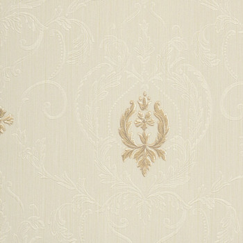 Vinyl, cream wallpaper with a metallic gray-beige baroque pattern.