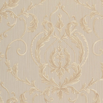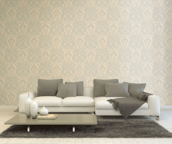 Vinyl, gray-beige wallpaper with a metallic baroque pattern.