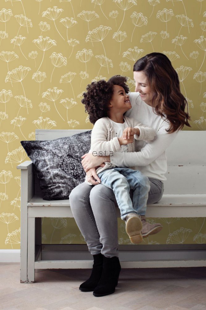 Non-woven wallpaper in a mustard colour and white plant motif.
