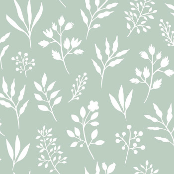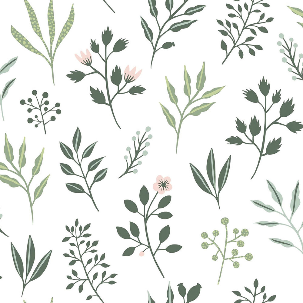 Non-woven, white wallpaper with a pattern of leaves and twigs in the Scandinavian style.
