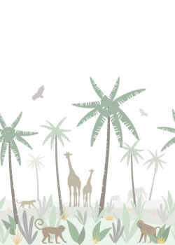 Non-woven white wallpaper with a jungle motif with animals in soft pastel colors. 4 parts