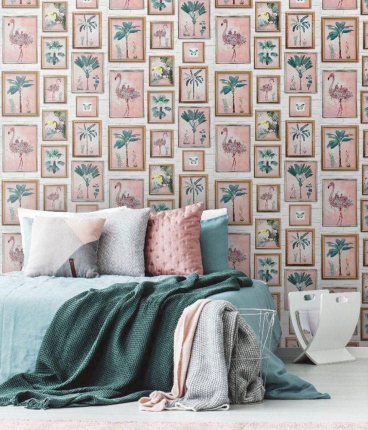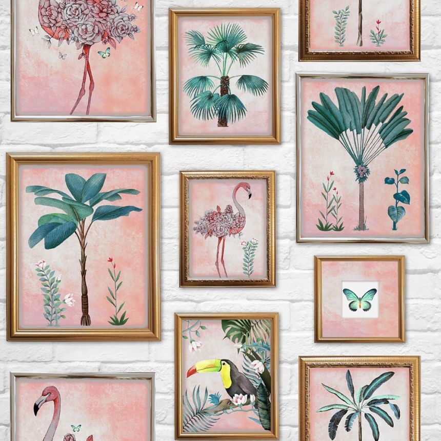 Bet on an unconventional design of framed pictures with tropical motifs on a brick wall. Smooth paper wallpaper.