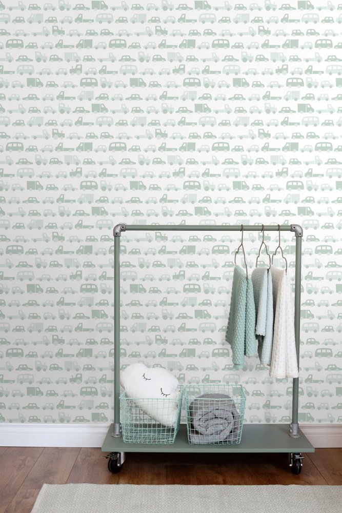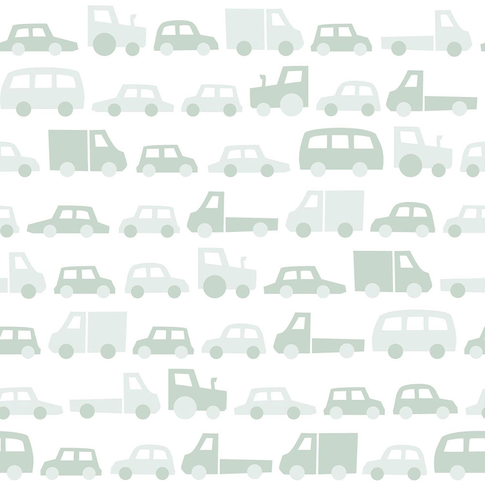 Non-woven, white wallpaper - toy car motif.