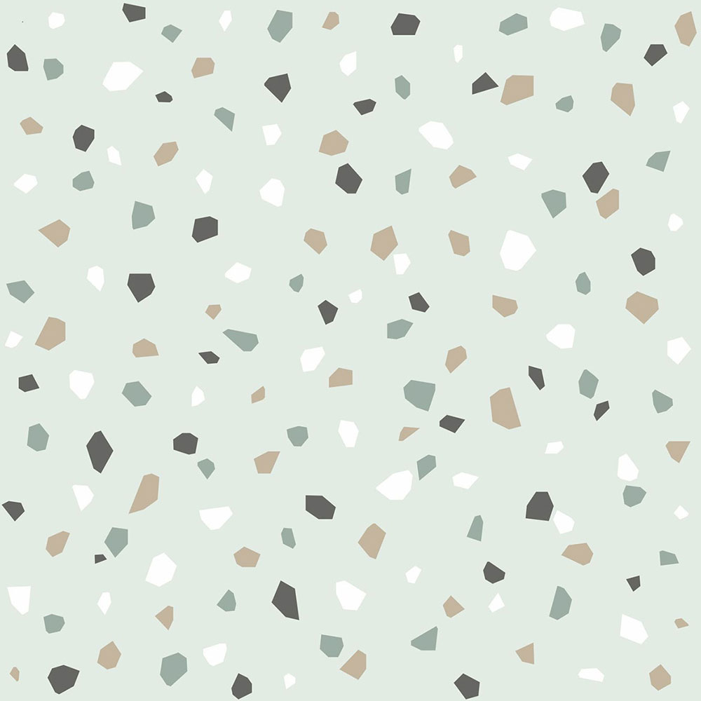 Non-woven, light green wallpaper with a delicate pattern of olored stones.