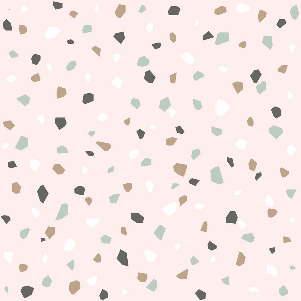 Non-woven, pink wallpaper with a pattern of colored stones.