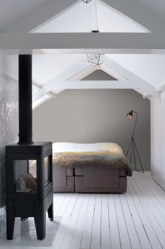 Non-woven, gray wallpaper with a delicate gray geometric pattern.