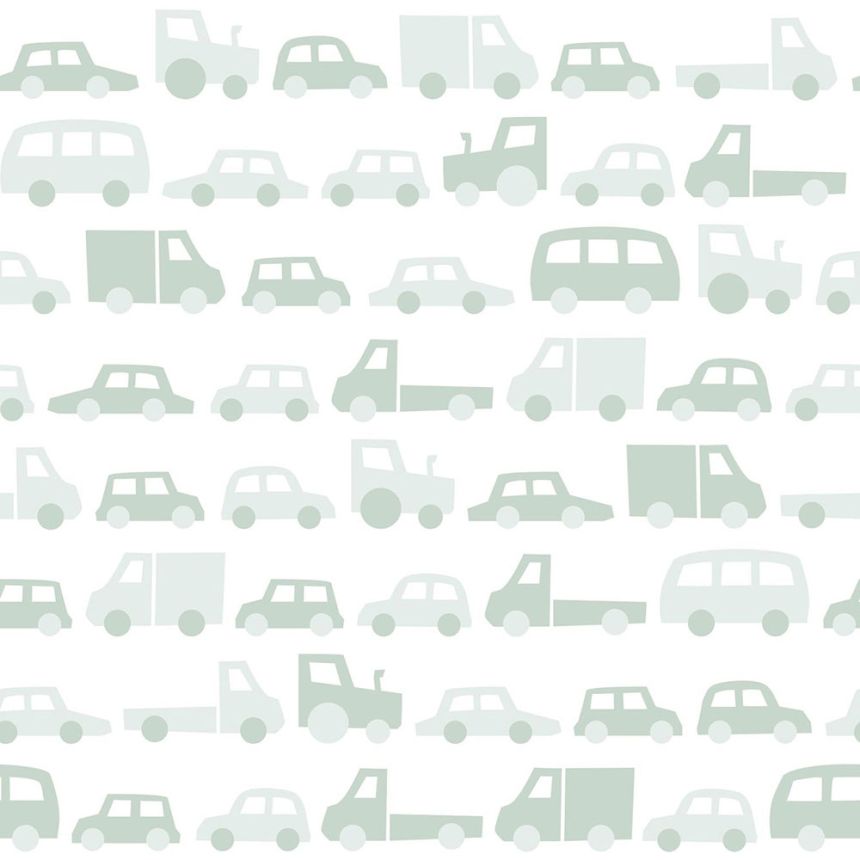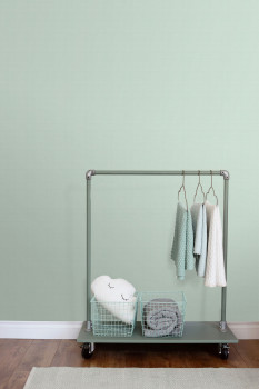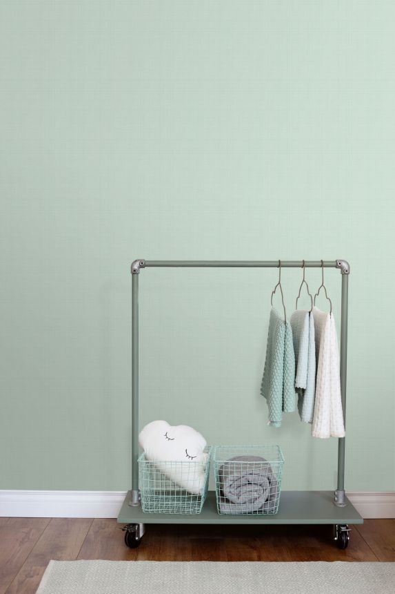 Non-woven, light green wallpaper with a delicate green geometric pattern.
