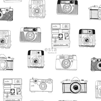 Non-woven white wallpaper with retro cameras in a brown-gold color.