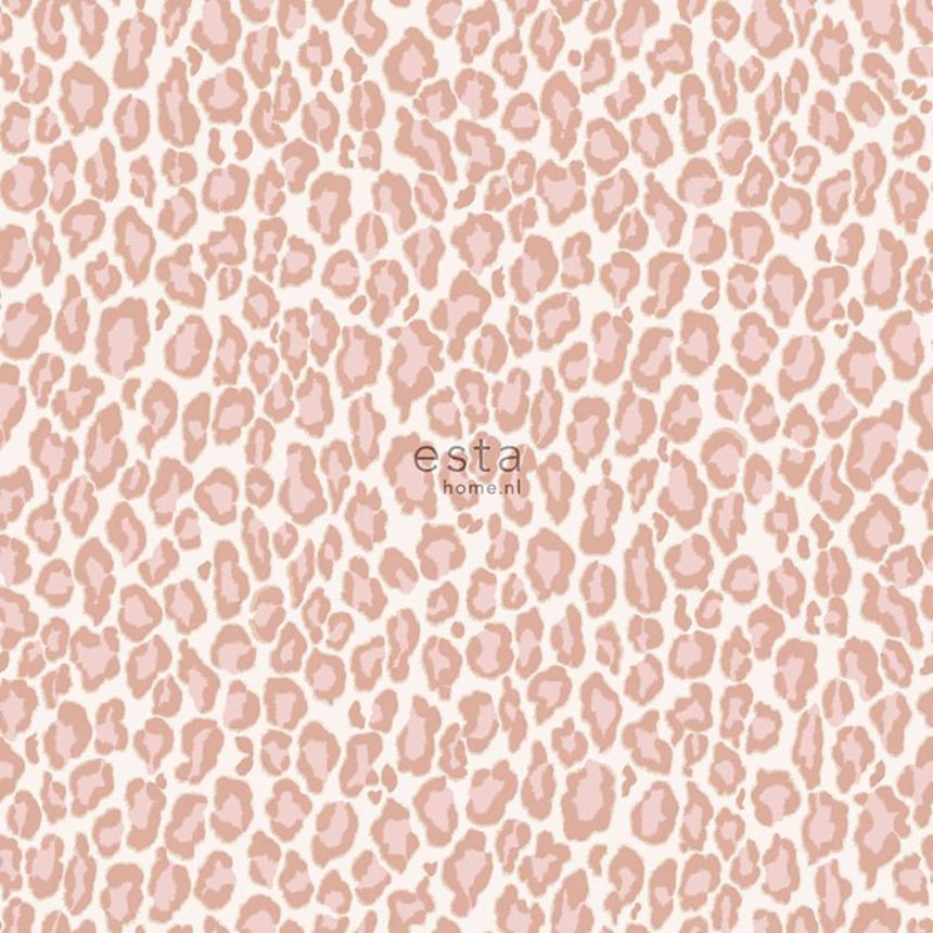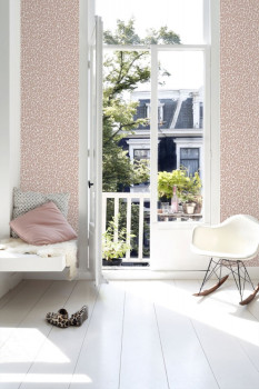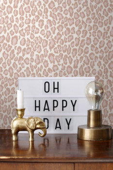 Non-woven white wallpaper, leopard skin imitation in pink-beige.