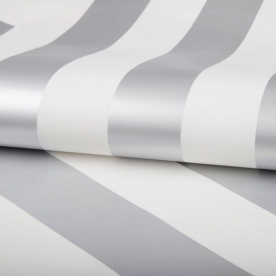 Timeless strips are very popular in present days. They are combinable with both pattern and monochrome wallpapers, or can independently define the interior and make the space cosier. Silver metallic and white stripes on a non-woven wallpaper.