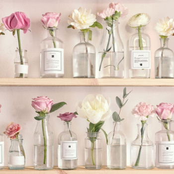 Romantic wallpaper with flowers on shelves. Flowers that never wither, always delight you and on shelves never settle dust ... :-)
