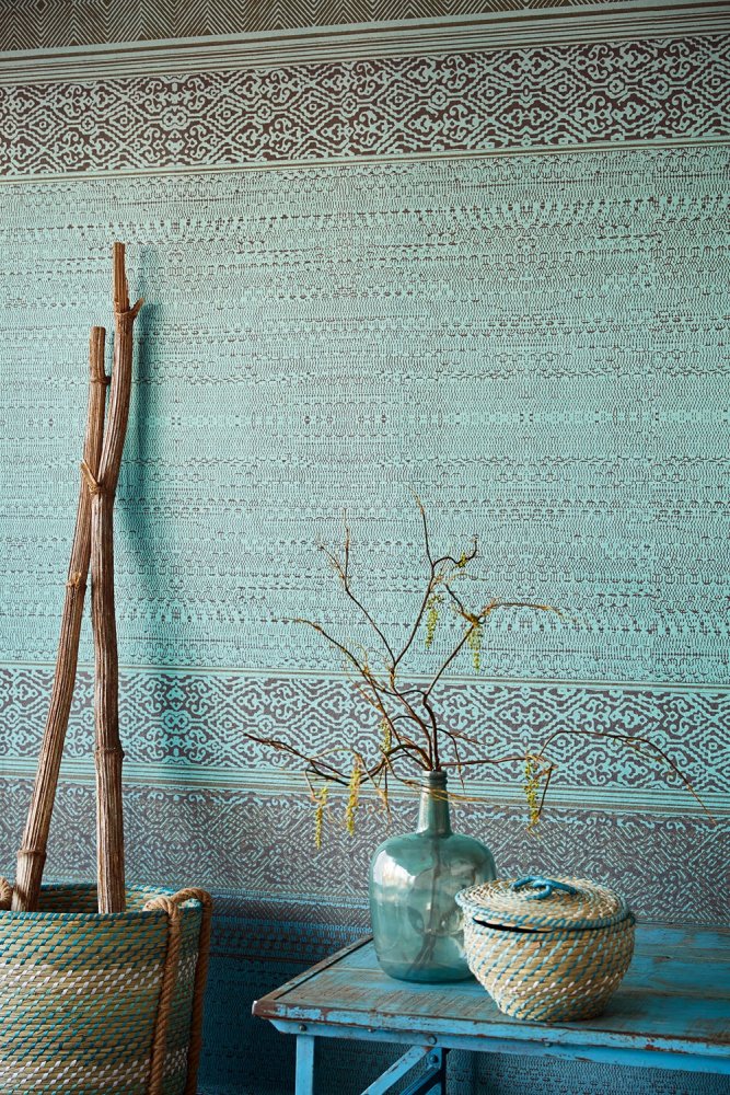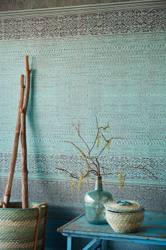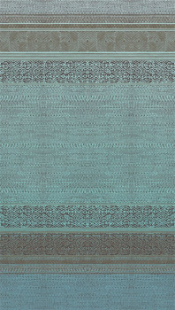 Non-woven mural wallpaper.Luxurious turquoise pattern with a soft pearlescent sheen on a dark brown background.