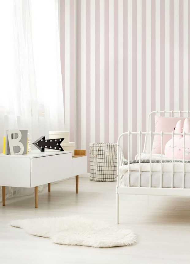Timeless strips are very popular in present days. They are combinable with both pattern and monochrome wallpapers, or can independently define the interior and make the space cosier. Elegant pastel pink and white stripes on a non-woven wallpaper. Ideal in combination with related patterns.