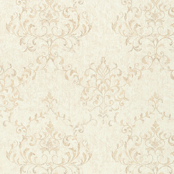 Luxury vinyl matte creamy-beige wallpaper with semi-glossy beige ornaments, design and texture of a fine fabric.