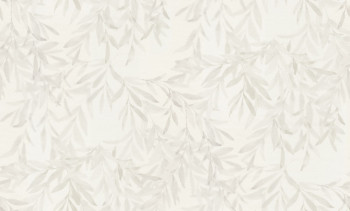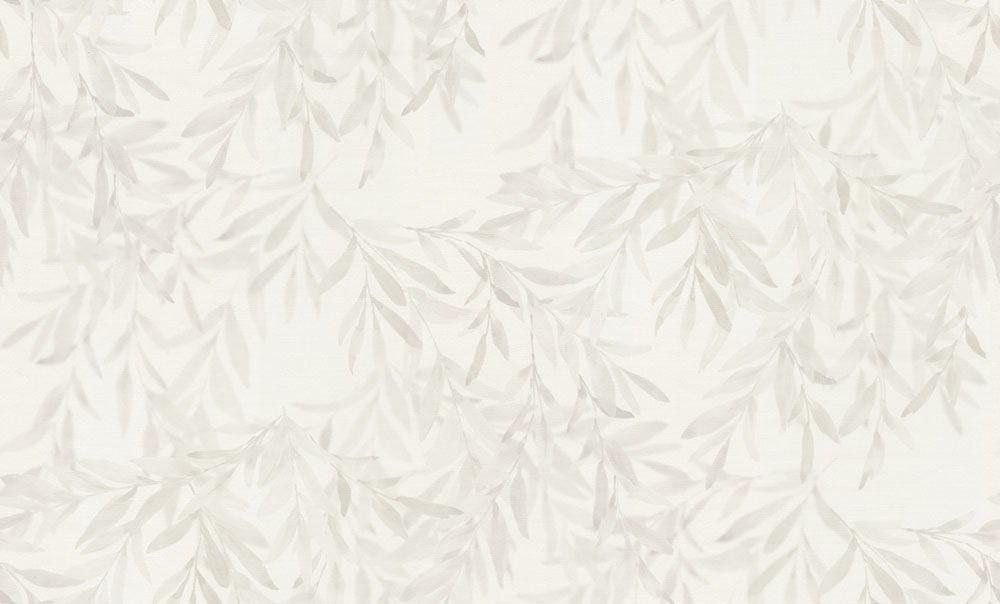 Non-woven wallpaper with a vinyl finish, cream-white background, twigs with leaves in shades of gray, fabric texture.