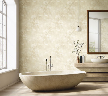 Non-woven wallpaper with a vinyl finish, floral pattern with a painted effect, in shades of beige and cream.